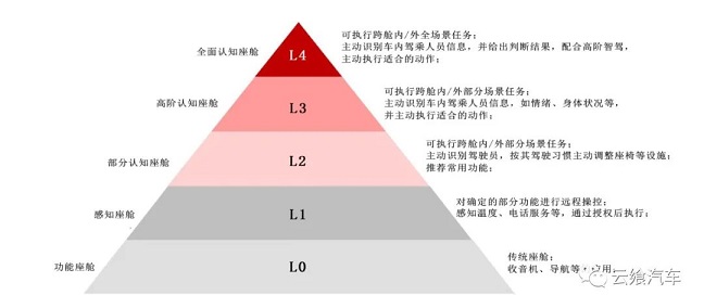 按其實(shí)現(xiàn)的能力對(duì)智能座艙進(jìn)行分級(jí),從人機(jī)交互、網(wǎng)聯(lián)服務(wù)、場(chǎng)景應(yīng)用與拓展三個(gè)維度進(jìn)行劃分,將其分為L0-L4這五個(gè)層級(jí)。