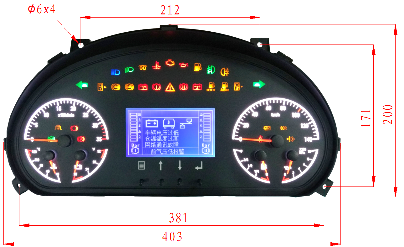 - 6個(gè)步進(jìn)電機(jī)驅(qū)動(dòng)的指針表盤 - 30個(gè)LED符號(hào)片 - 多個(gè)TFT符號(hào)片 - 5寸TFT單色屏 - 一個(gè)多音頻蜂鳴器 |