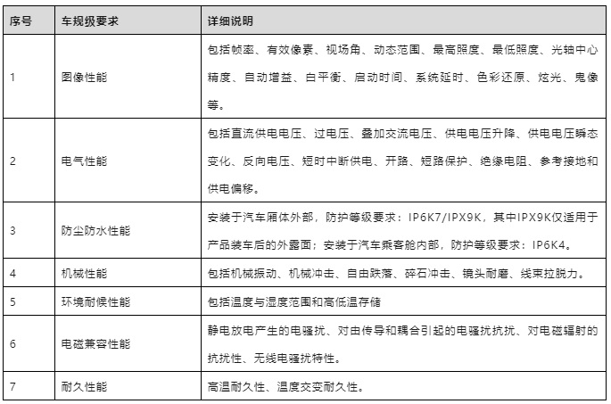 圖表4. 車載攝像頭車規(guī)級要求(信息來源:《QCT/T 1128 汽車用攝像頭》、公開資料整理)