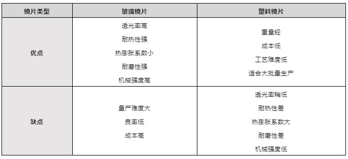 光學(xué)鏡頭通常由多片鏡片構(gòu)成,按鏡片的材質(zhì)可分為三種類型:塑膠鏡頭、玻塑混合鏡頭和玻璃鏡頭。由于車載鏡頭有高耐用性和高穩(wěn)定性等要求,故車載鏡頭通常會選用玻塑混合鏡頭或玻璃鏡頭。