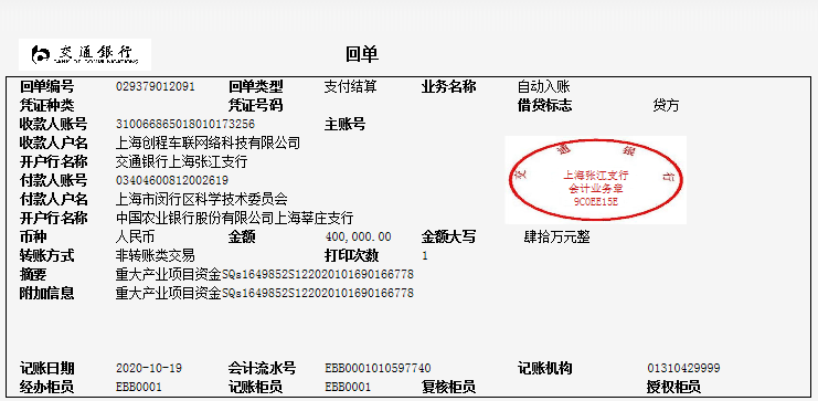 2020年8月,根據(jù)《閔行區(qū)關(guān)于推進(jìn)科技創(chuàng)新創(chuàng)業(yè)和成果轉(zhuǎn)化的政策意見(jiàn)》(閔府規(guī)發(fā)〔2019〕1號(hào))及操作細(xì)則,上海創(chuàng)程“基于5G技術(shù)的智能網(wǎng)聯(lián)公交系統(tǒng)”項(xiàng)目立項(xiàng)獲得成功,10月份,我司該項(xiàng)目已通過(guò)上海市閔行區(qū)科學(xué)技術(shù)委員會(huì)的驗(yàn)收,并獲得50%項(xiàng)目經(jīng)費(fèi),共40萬(wàn)元,另一半項(xiàng)目經(jīng)費(fèi)預(yù)計(jì)明年撥付。