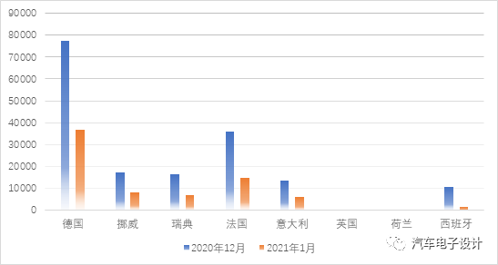 圖1 2021年1月份歐洲主要國(guó)家的新能源汽車銷量