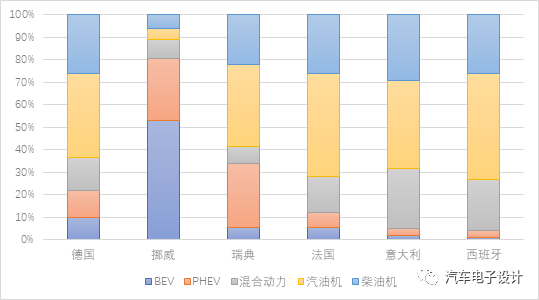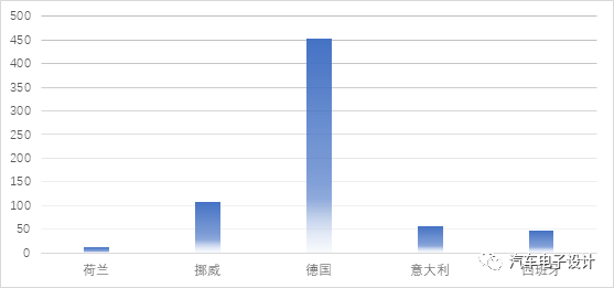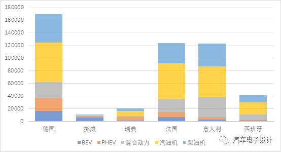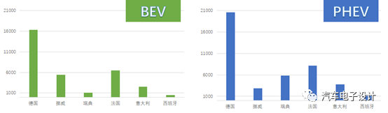 從新能源汽車的角度來(lái)看,德國(guó)、挪威、瑞典、法國(guó)和意大利的新能源汽車的銷售數(shù)量分別為36,903、8,309、6,893、14,654、6,254,西班牙稍少一些為1595臺(tái)。這個(gè)數(shù)據(jù)在去年年末沖量的基礎(chǔ)上開始回落,但是也是一個(gè)比較高的水平。