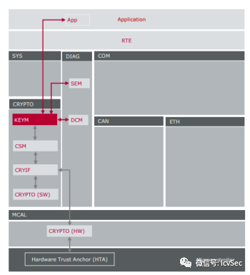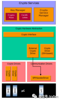 Crypto (HW)模塊作為訪問安全算法和函數(shù)的驅動程序,通過硬件信任錨(HTA)提供。有不同的HTA類型,如安全硬件擴展(SHE)和硬件安全模塊(HSM)。