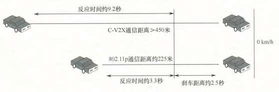 圖中例子是汽車以140km/h速度行駛的時候,采用LTE-V2X的汽車比采用DSRC技術(shù)的汽車擁有額外的5.9s(9.2s~3.3s)來決定是否剎車。
