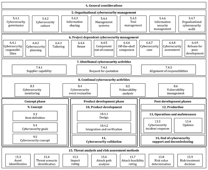 ISO/SAE 21434由15章組成,主題部分為4~15章,包括組織及項(xiàng)目層級(jí)的網(wǎng)絡(luò)安全管理,客戶(hù)與供應(yīng)商之間的職責(zé)分配,對(duì)量產(chǎn)后網(wǎng)絡(luò)安全的持續(xù)監(jiān)測(cè)分析,第9~14章描述了從概念設(shè)計(jì)階段到產(chǎn)品開(kāi)發(fā),驗(yàn)證,生產(chǎn)及運(yùn)維和報(bào)廢的全生命周期的網(wǎng)絡(luò)活動(dòng)和相關(guān)要求。在最后一章,標(biāo)準(zhǔn)提供了一套網(wǎng)絡(luò)安全威脅分析,風(fēng)險(xiǎn)評(píng)估的方法論(TARA)。