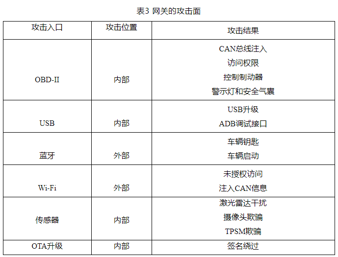 網(wǎng)關(guān)也是智能汽車(chē)最可能成為網(wǎng)絡(luò)攻擊的目標(biāo),網(wǎng)關(guān)一般是RTOS系統(tǒng),能夠弄清楚他的指令集是關(guān)鍵,網(wǎng)關(guān)的主要攻擊面(非詳盡),如表3所示。