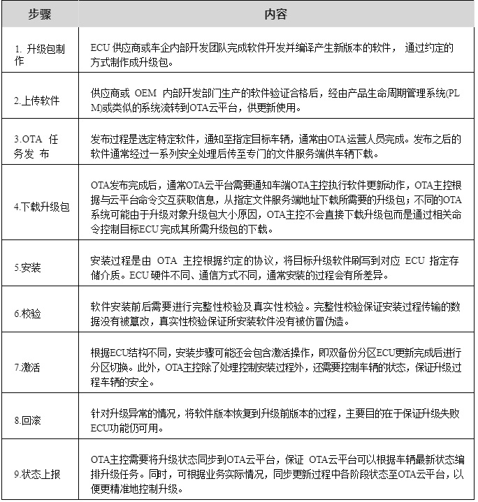 圖2-1 是一個典型的 OTA 系統(tǒng)框架,包含了三個基本要素,即云端的 OTA 平臺、車端 OTA 主控、OTA 對象。其中:OTA 云平臺負(fù)責(zé) OTA 升級包管理、車輛管理及 OTA 發(fā)布等功能,車端 OTA 主控負(fù)責(zé)從 OTA 云平臺下載升級包并將其刷寫到目標(biāo) ECU ,OTA 升級對象即最終軟件刷寫的主體,從主控接收軟件并完成自身軟件更新。OTA 的基本實現(xiàn)流程(圖2-1)可歸納為下表 2-3 所示步驟。